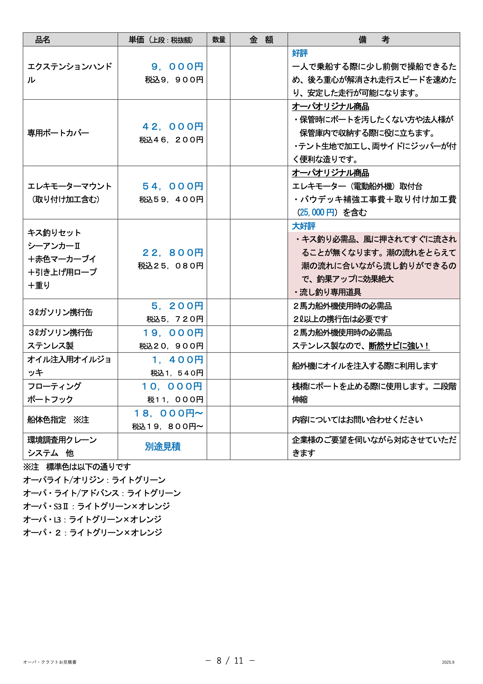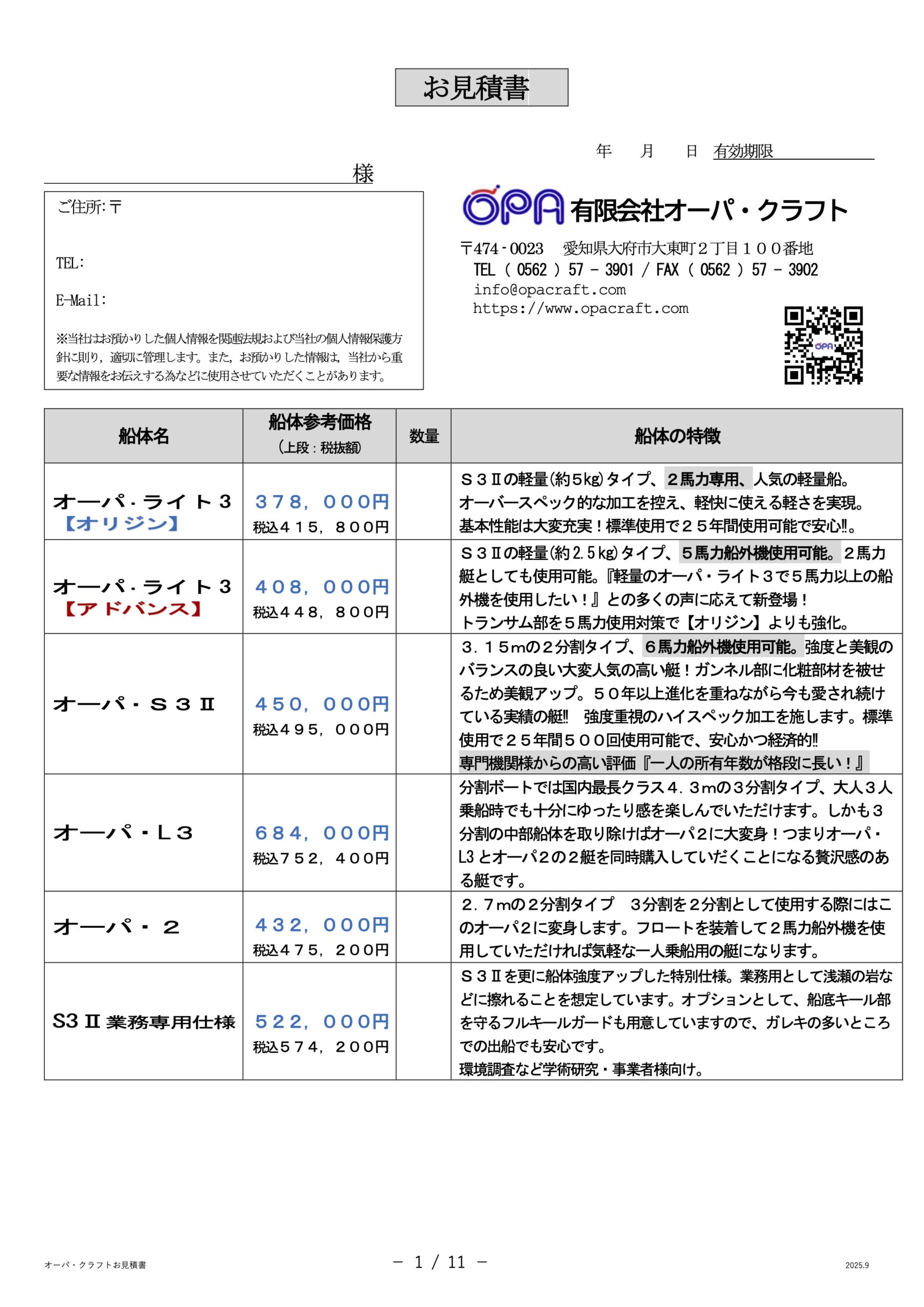 オーパ・クラフトのレジャー用小型・分割ボートの価格見積書やカタログなどをご覧いただけます。 パソコンでご覧いただいている場合,各ファイルをダウンロードしていただけます。